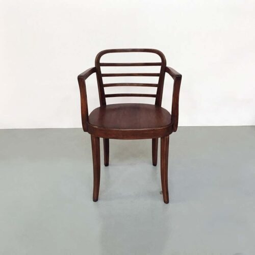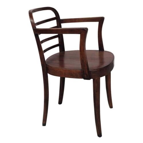 Kursi Cafe Kayu Bellotti dengan sandaran lengan, kaki bagian persegi, sandaran dengan strip melengkung dan batang kuningan di bagian belakang kursi. Dipugar seluruhnya sehingga dalam kondisi sempurna. Desain yang menyenangkan dan meyakinkan benar-benar menarik perhatian.