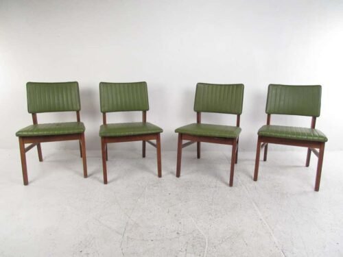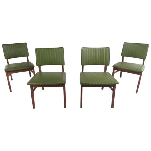 Kursi Cafe Minimalis Marble Rangka kayu jati solid bersudut dengan jok dan sandaran punggung yang dilapisi jok kulit imitasi berwarna hijau.