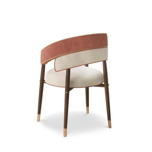Kursi Cafe Modern Marlene Didandani dengan beludru katun halus dan ditopang oleh kaki kayu jati buatan tangan.