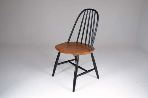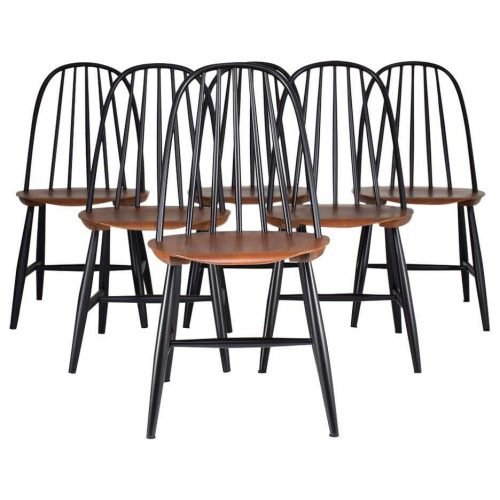 Model Kursi Cafe Scandinavian yang terdiri dari kayu jati dan dirancang dengan sandaran panel bundar dalam pernis hitam.